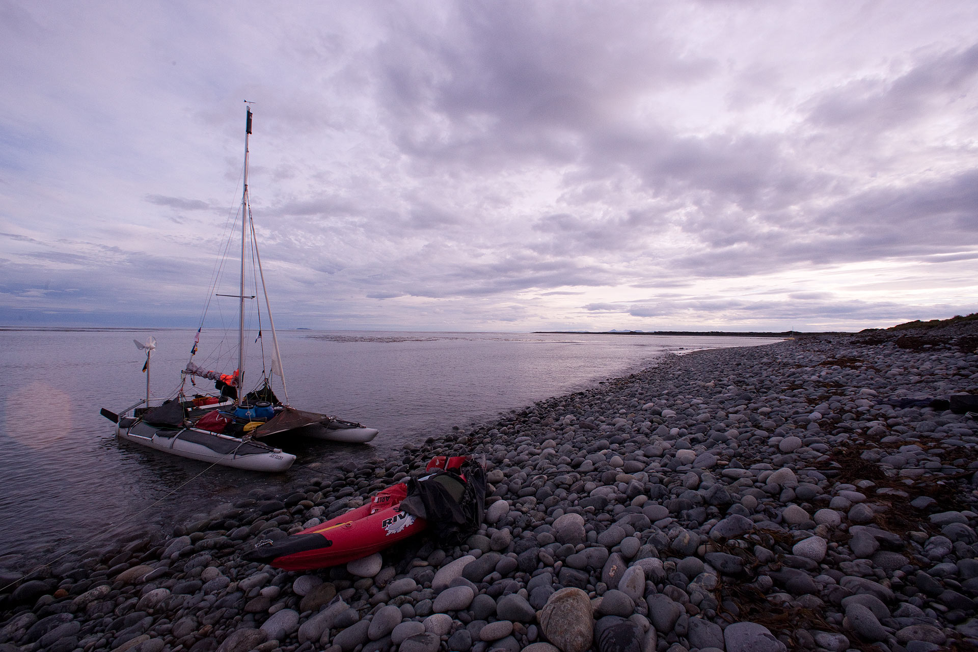 Виде на фоне берега приставший катамаран. Идём прямо на него, и во незадача, путь преграждает поле водорослей и постепенно появляющаяся из под воды каменная банка. Сейчас похоже отлив. Не дошли до ребят метров триста. Разглядываю в бинокль водоросли. Чтобы подойти поближе нужно сделать круг в пару километров. Не хочется, решаем стать тут. И сходить в гости ножками.