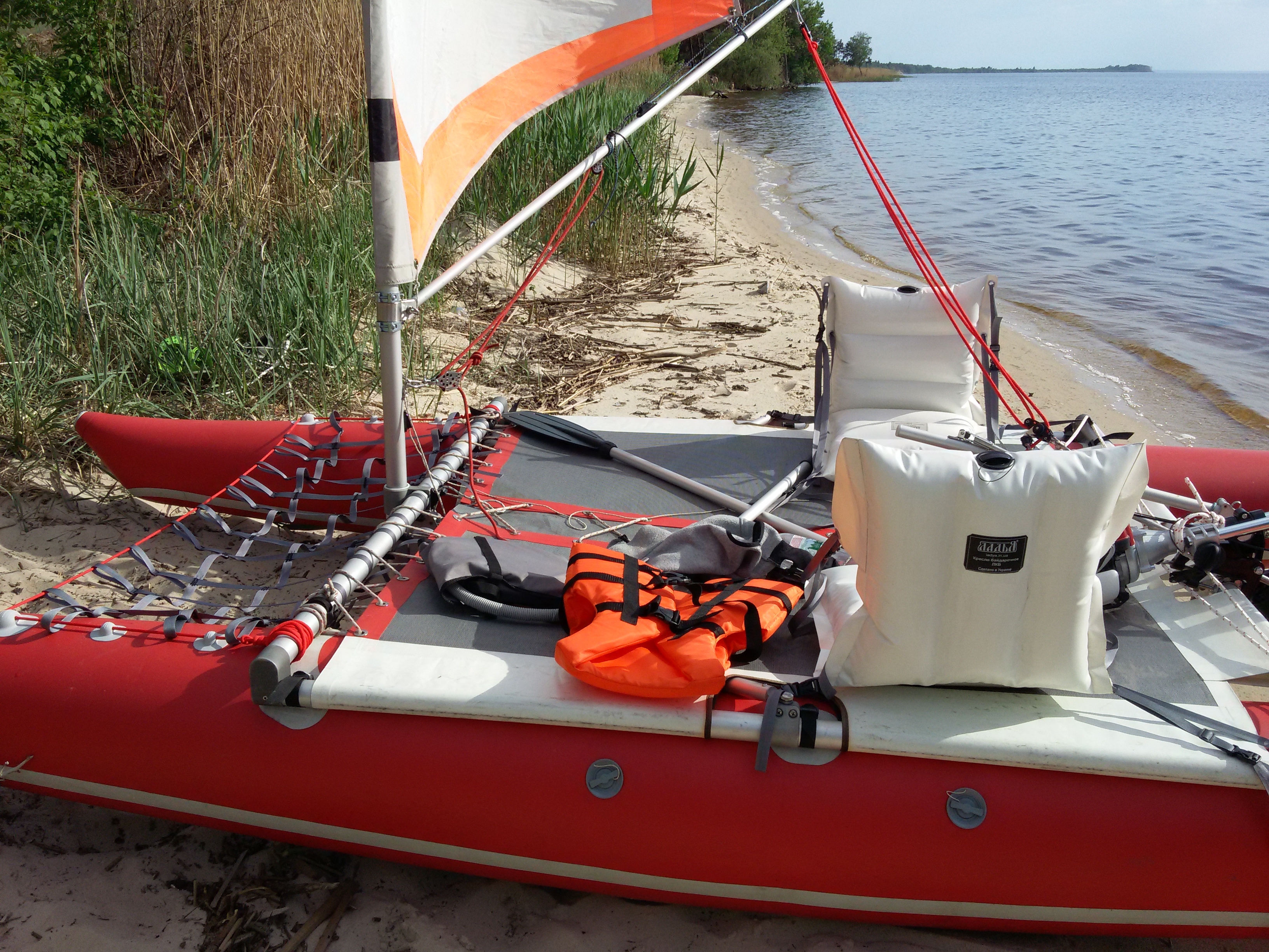 Вот еще один апгрейд, может кому интерестно будет, на носу сделал грузовую сетку для легких обьемных вещей (правда не угадал с размером, поправлю), поставил кресла байдарочные, стало весьма комфортно, попа сухая, спина не затекает, в сдутом состоянии чудесно умещаются в сумку с баллонами, по случаю приобрел моторчик Шмель, ну и установил его сразу, теперь не зависим от ветра, моторчик тарахтит конечно довольно сильно , но тянет примерно 7-8 км в час на максимуме, при 6 км в час уровень шума более менее приемлемый, но конечно под парусом гораздо приятнее, пока что выходим в выходные, время ограничено и нужно гарантированно возвращаться. На сейчас вроде все что хотел сделал.