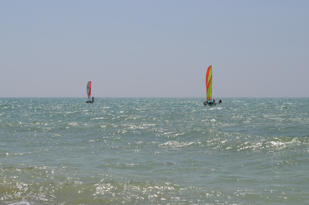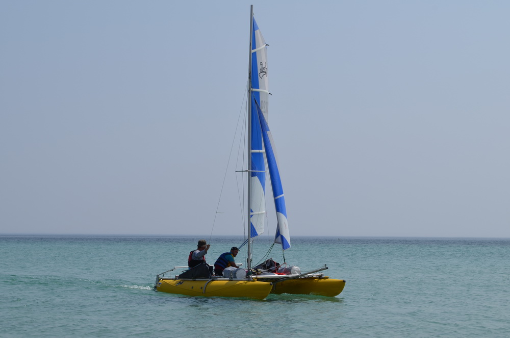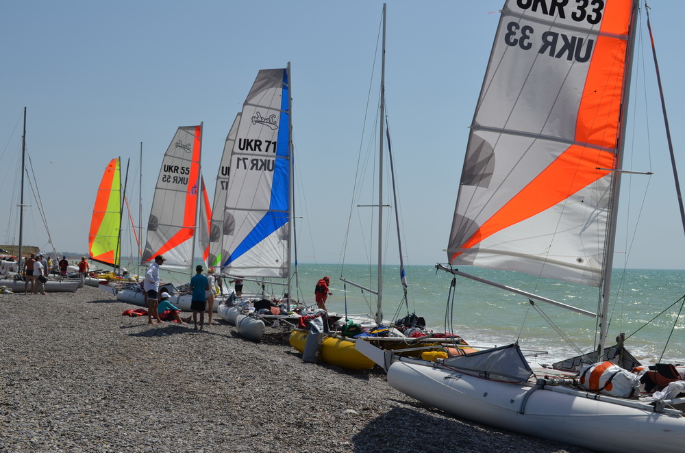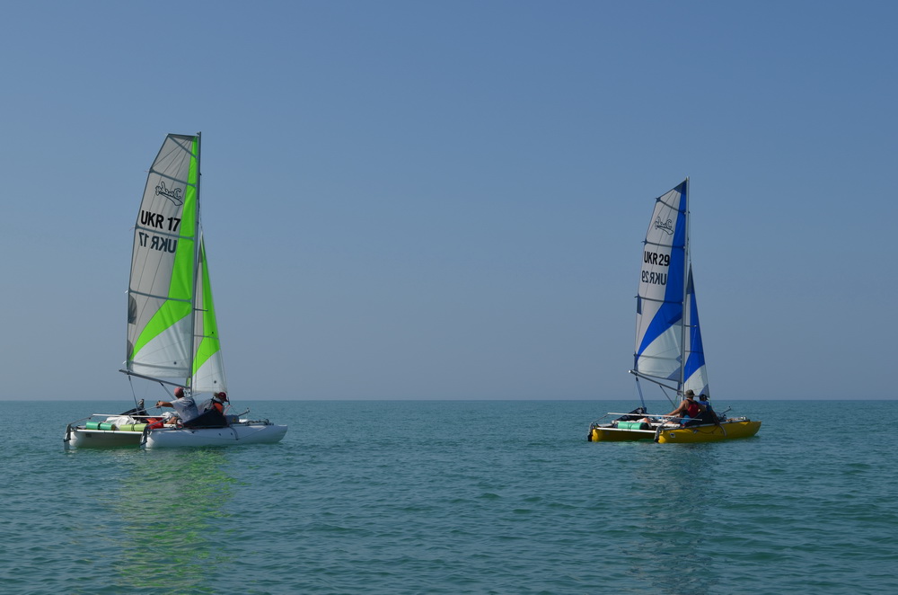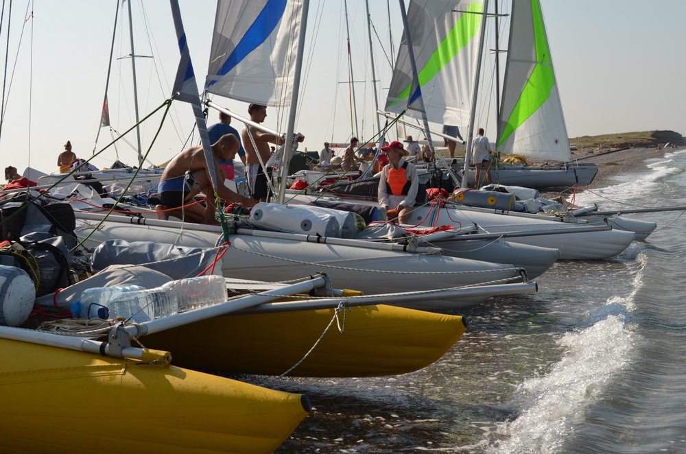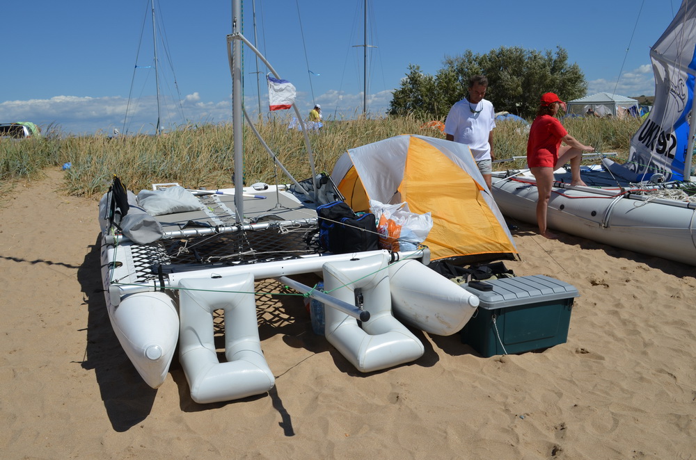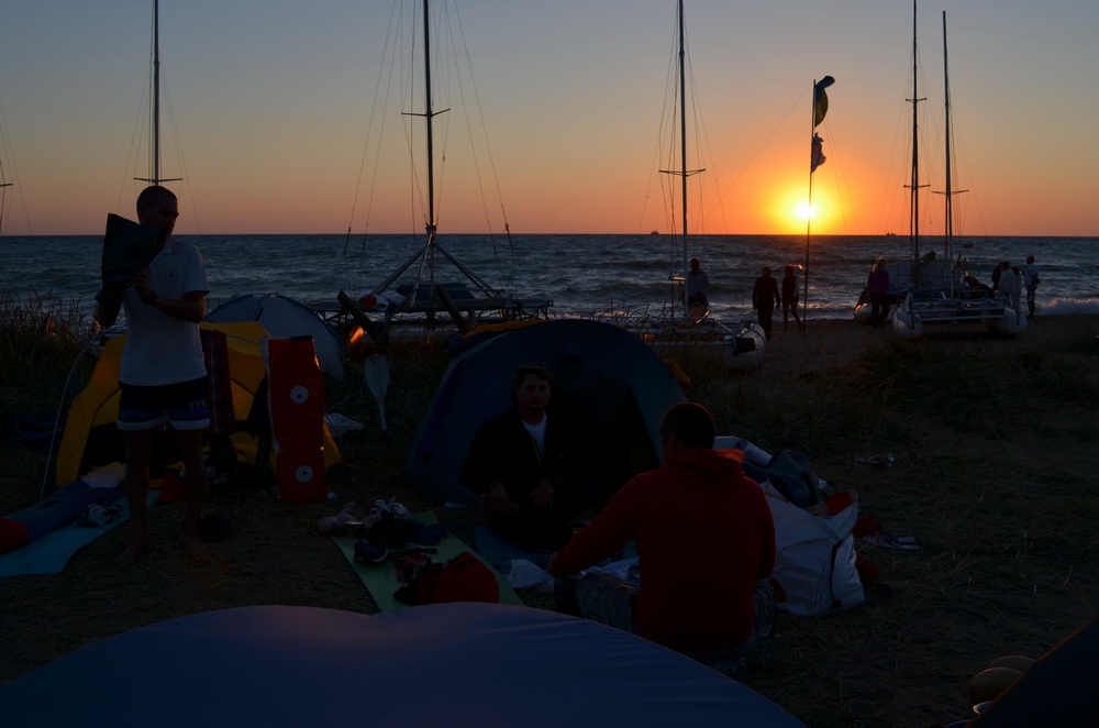 03.08.2013 Сбор команд был назначен в пос. Орловка. Мы – четыре экипажа из Киева: «Песец», «Пепелац», «Победа» и «Шкода», благополучно добрались до базового лагеря вечером, 3 августа. Погода была не жаркой, обычный вечер на берегу моря не обещал никаких сюрпризов. Те, кто приехал раньше уже успели собрать свои катамараны или находились в процессе. Нам, после дороги, заниматься сборкой было лень, тем более, что завтра был целый день, предназначенный для этого. Так, немного посидев, мы разошлись по палаткам, сморенные поездкой. Ночью меня разбудил несильный дождь. Ветер был также не сильный, одним словом ничего необычного. Я уже было приготовился снова уснуть, но дождь начал набирать обороты. Появилась мысль пойти обтянуть палатку, на случай, если дождь будет сильным и затяжным, но сделать этого я не успел. Вместе с дождём усилился и ветер. Налетел шквал. Силу ветра, сидя в палатке оценивать сложно, но учитывая нашу ветроустойчивую палатку, ветер был сильным. Капли дождя ударяясь в палатку, пробивали ткань, и внутри палатки стояла мелкая водная пыль. Ветер пытался сложить палатку и было опасение, что её может сдуть вместе с нами. Несколько порывов было особо яростных. Длилось это безобразие 15-20 минут. Как только ветер с дождём стихли, удалось выбраться наружу, чтобы как следует раскрепить палатку. Первая мысль, которая меня посетила, когда я выбрался из палатки, была – А что здесь делает этот катамаран?! Рядом с нашей палаткой, немного придавив соседнюю, лежала на боку «Синильга» (Даки17). Дело в том, что вечером она стояла метрах в десяти, в стороне. Сила ветра была такой, что её оказалось достаточно, чтобы сдуть с берега катамаран без парусов. Повезло, что пролетев, он не раздавил ни одну из палаток. Причём, его мачта уже была в тамбуре одной из палаток. При первичном осмотре катамаран выглядел целым. Как оказалось позже, улетели все три собранных на тот момент, катамарана. Ещё один катамаран самостоятельной постройки, в процессе кульбитов сломал мачту. Больше всего шороху навёл катамаран «Рассвет» (Даки17). Сначала, он влетел в припаркованный легковой мерседес, разбив ему лобовое стекло, слегка помяв и распилив вантой переднюю стойку. А затем, перевернувшись через мачту, упал на палатки. Чудо, что никто из людей сильно не пострадал. Беглый осмотр катамарана оптимизма не внушал: согнутая в дугу мачта, отломан один из кронштейнов крепления рулевой коробки, деформирована сама рулевая коробка, пострадала краспица. Оттащив катамаран с палатки, решили заняться ремонтом утром. Вернувшись к своим палаткам, уже собирались лечь спать, как вдруг, к нам подошёл мужик со швертом от «Удачи» с вопросом: Ребята, это не ваше? К слову, это доска, длиной около 2 метров. Он его нашел валяющимся, на дороге, за лагерем. Шверт, вечером оставили на трамплине катамарана. Шквалом его сдуло и он пролетел метров 30 над лагерем. Чудеса да и только. Тем временем ветер скис совсем, на небе мирно сияли звёзды и ничто не напоминало о пережитом.