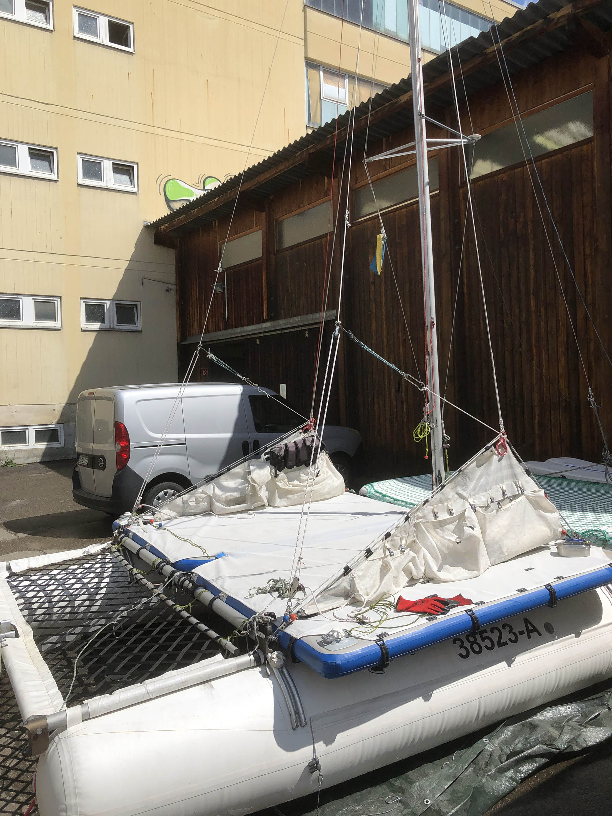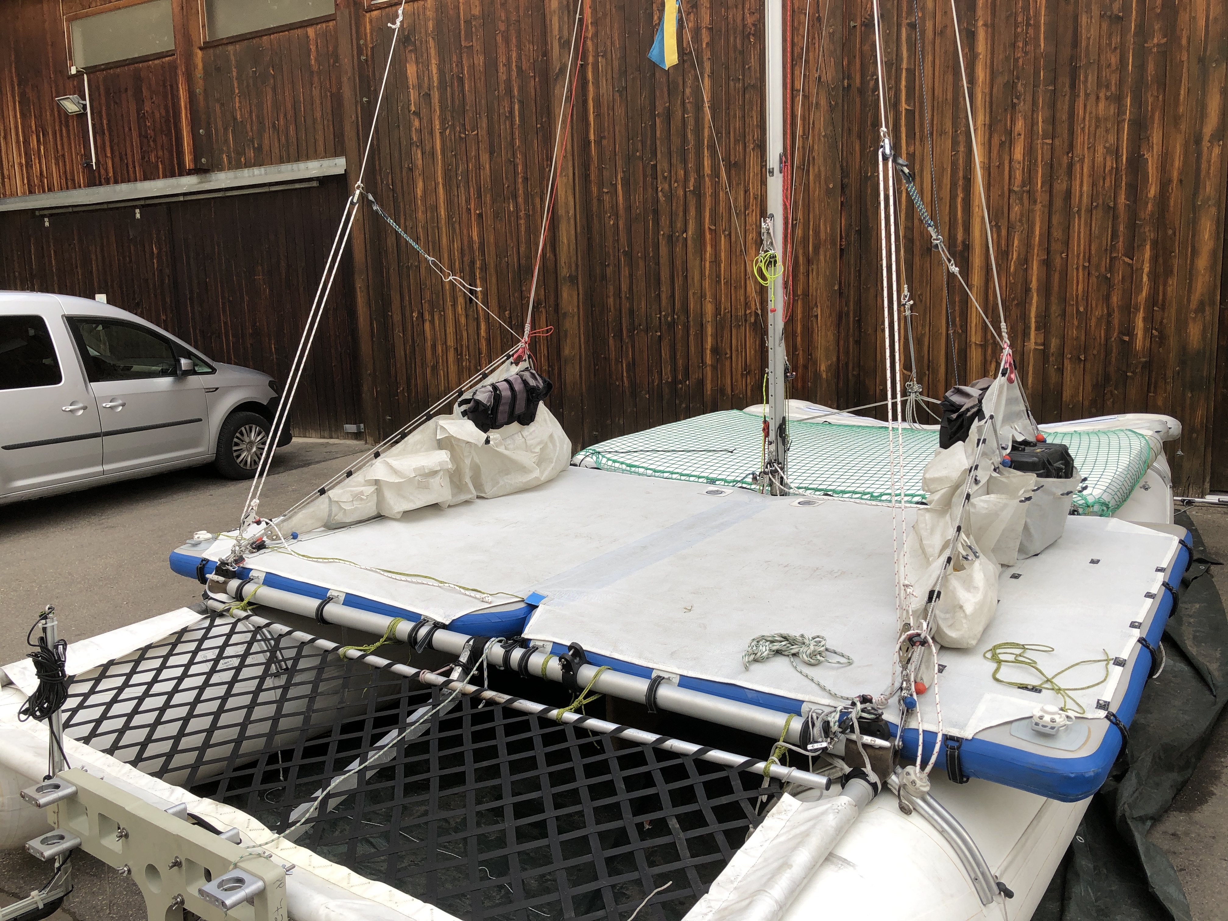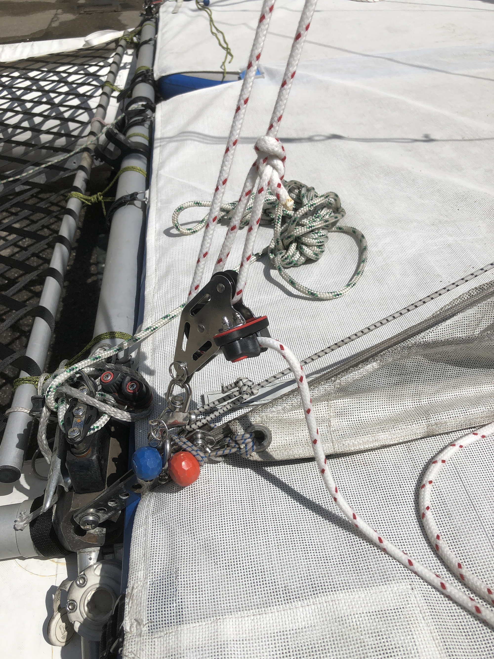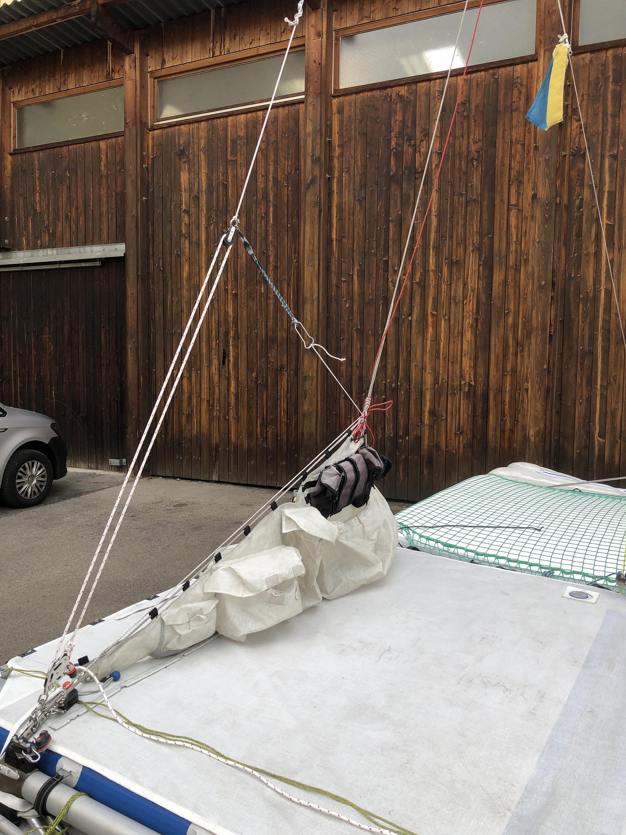 Когда выходишь на трапецию и одновременно управляешь судном очень сложно удержаться в корме. Трапеция постоянно тянет вперед. Я уже даже подумывал соорудить петли для ног как на серфе. Но оказалось, что если трапецию встроить как часть закладного бакштага, то проблема утаскивания к мачте исчезает сама собой, т.к. полиспас бакштага дает возможность зафиксировать точку подвеса в удобном для рулевого месте.