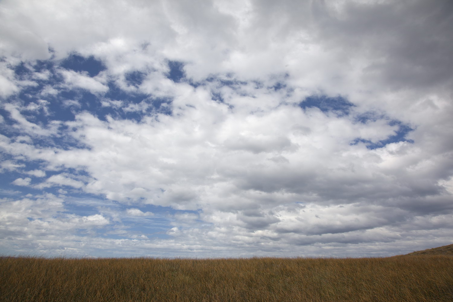 Поднимались на холм, к которому притулился наш домик. Сверху он плоский и выглядит как степь. Но ходить по этой траве крайне тяжело и опасно: высокая и густая, она скрывает все неровности почвы, кочки и глубокие промежутки между ними. Того и гляди, ногу сломаешь. Пришлось просто прогуляться по краю этого поля, где ветрами сорвана трава и можно без опаски ходить.