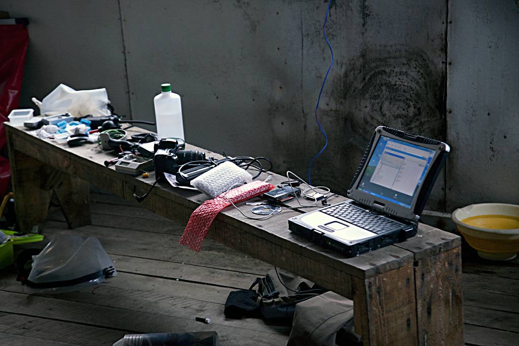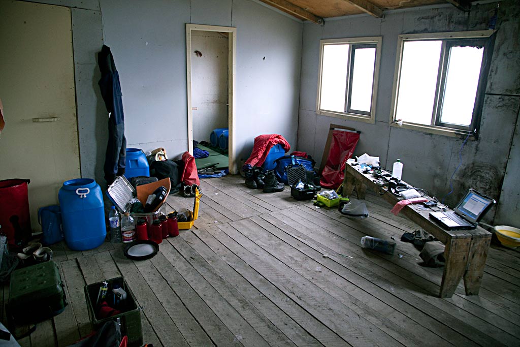 Ночью пошёл дождь, пришлось заткнуть дыру надо мной, но это не помогло. Крыша текла в нескольких местах, и капли, падая с потолка на пол, разбивались и эти брызги долетали до нас. Пришлось вспомнить порядок действия если затопило соседей сверху - подставили под все места посуду. Брызг стало меньше, но шума от капель больше. Утром почистили другую комнату и перебрались туда. Пользуясь моментом, я раскидал всю аппаратуру для просушки на сухих местах.